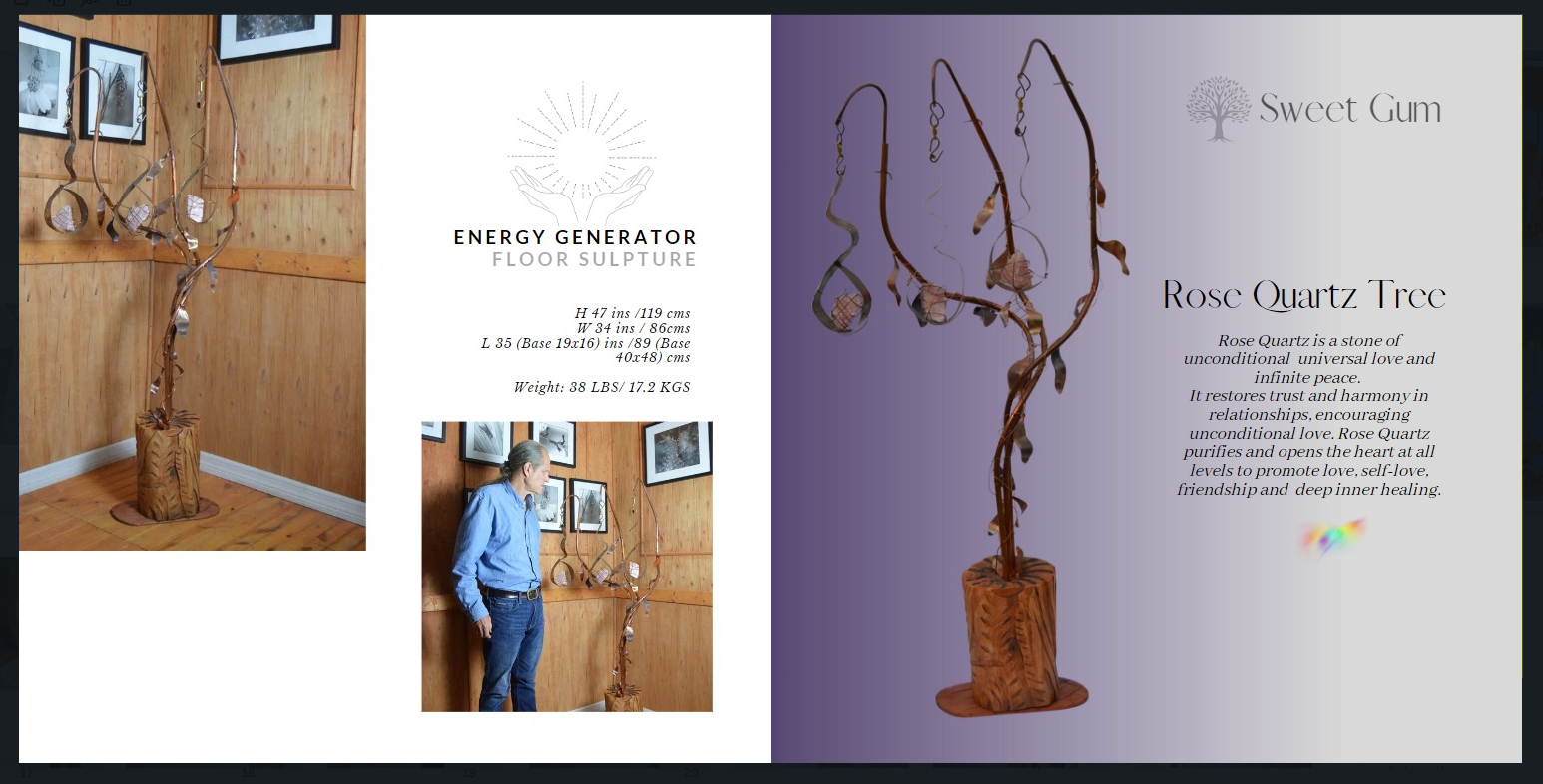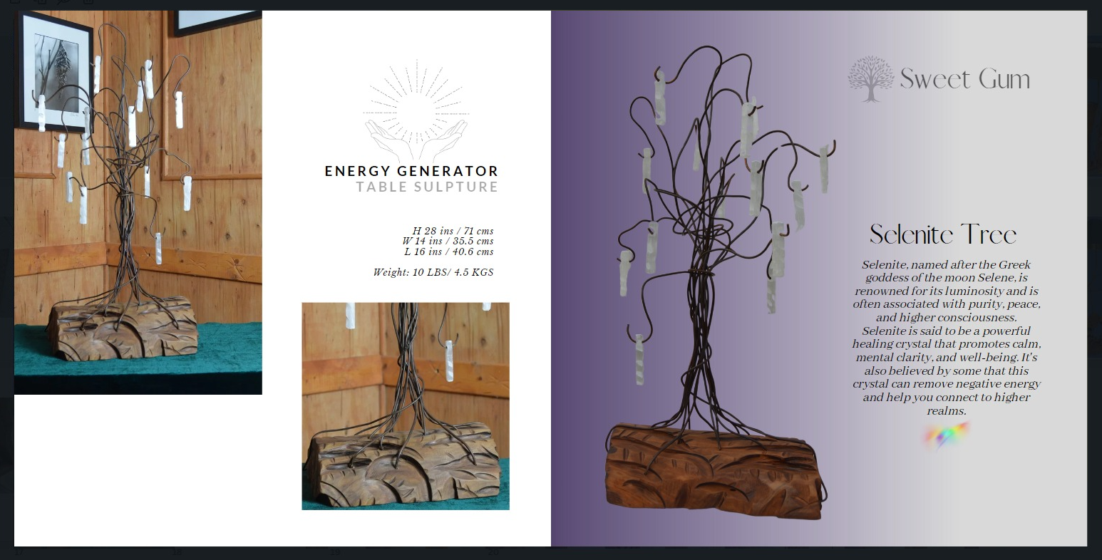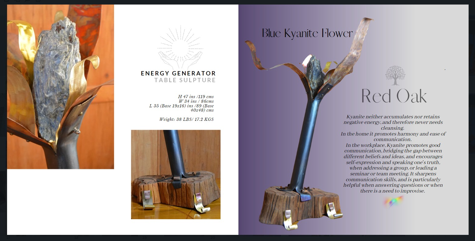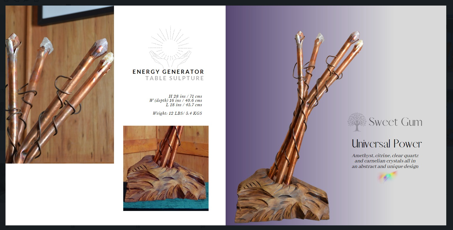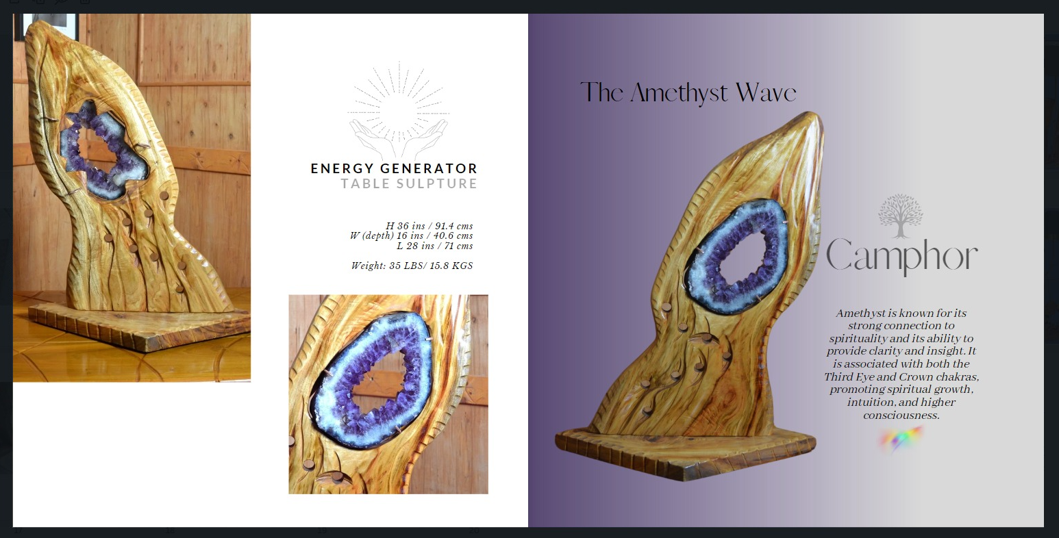 Each sculpture comes with a description card of the crystal selected and its suggested focus or application. These sculptures are all center pieces that are exclusive and original in every sense of their creation.